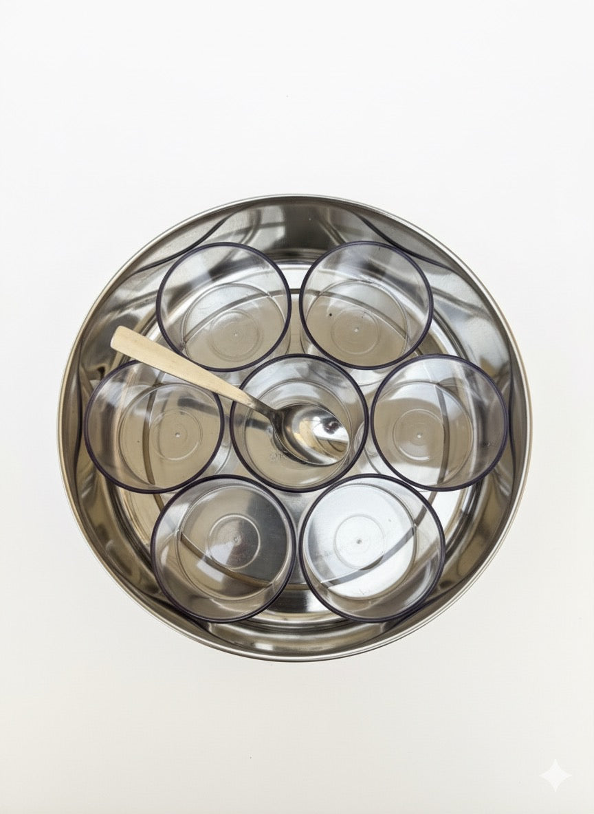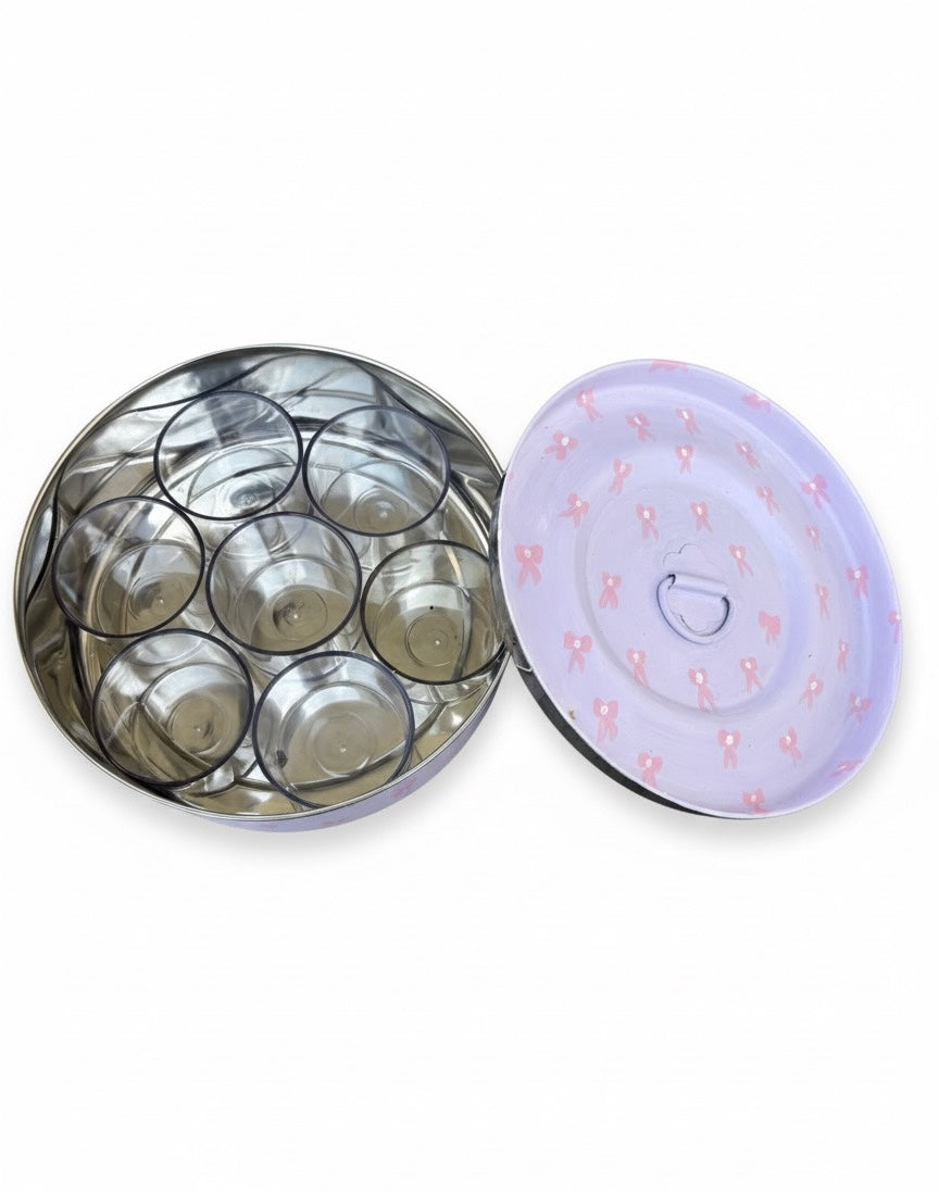 Keep your kitchen organized in style with this Handpainted Bow Spice Box. Made from durable stainless steel, it features 9 small containers to store your favorite spices. The soft lavender lid with delicate pink bow designs adds a cute, handcrafted touch to your kitchen décor.