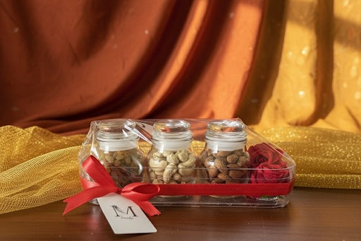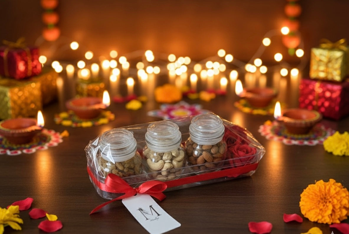 The Festive Trio is a premium dry fruit gift set featuring three elegantly packed jars of handpicked nuts. Perfect for Diwali gifting, it blends health, taste, and tradition in one festive box.